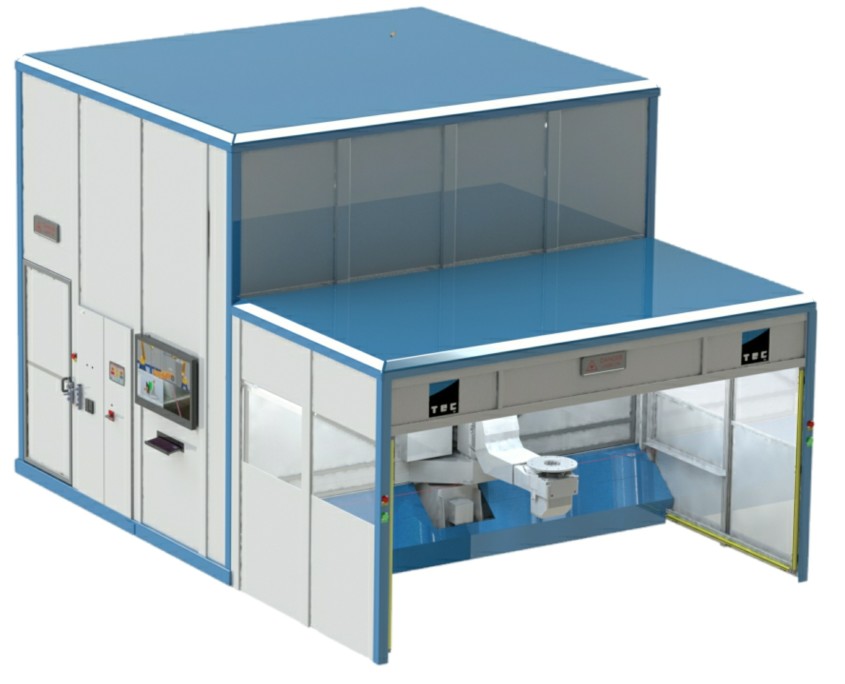 Enclosed within a Class 1 safety enclosure, the system complies with all safety norms. The operator loads and unloads the manipulator from outside the enclosure and is protected by a safety light curtain.